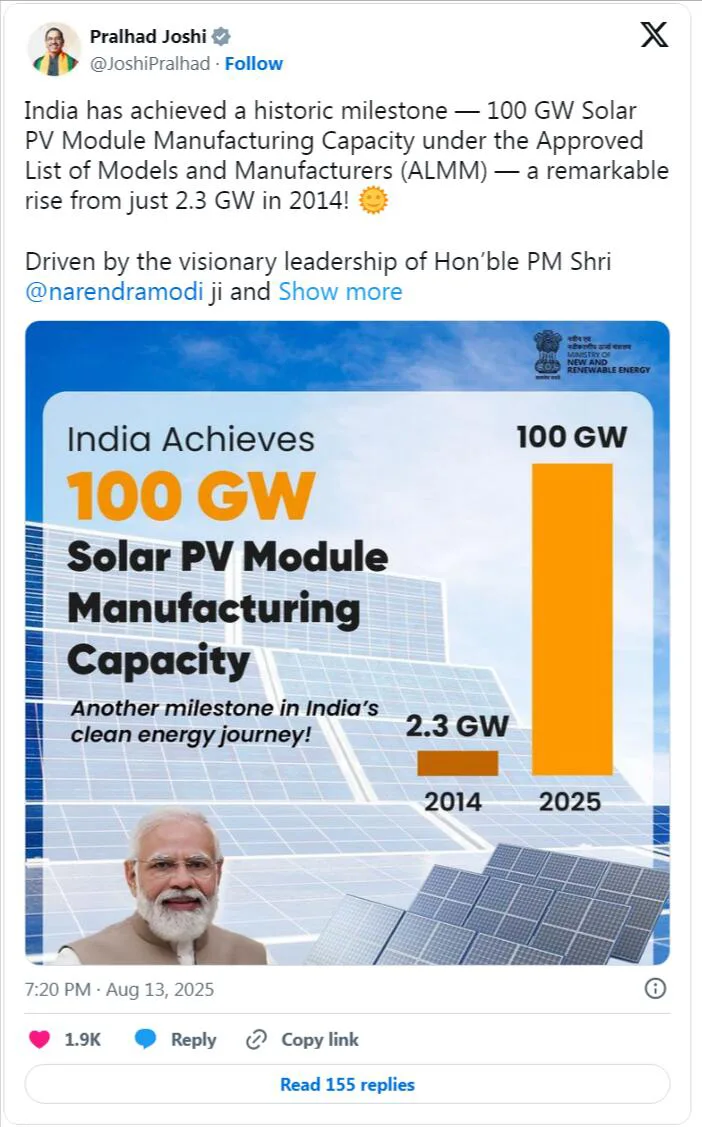 Prahad Joshi, Menteri Aliansi Energi Baru Terbarukan India, menekankan pencapaian ini, dengan menyatakan: "India telah mencapai tonggak sejarah - berdasarkan Daftar Model dan Produsen yang Disetujui (ALMM), kapasitas produksi modul fotovoltaik surya telah mencapai 100 gigawatt, peningkatan yang signifikan dari 2,3 gigawatt pada tahun 2014! Di bawah kepemimpinan visioner Perdana Menteri Narendra Modi dan kekuatan pendorong inisiatif transformatif tersebut sebagai Skema Insentif Terkait Produksi Modul Surya yang Efisien (PLI), India sedang membangun ekosistem manufaktur tenaga surya yang kuat dan mandiri. Pencapaian ini akan meningkatkan langkah menuju Atmanirbhar Bharat dan membantu India mencapai tujuannya untuk mencapai kapasitas produksi energi non-fosil sebesar 500 gigawatt pada tahun 2030.