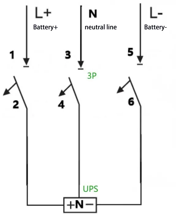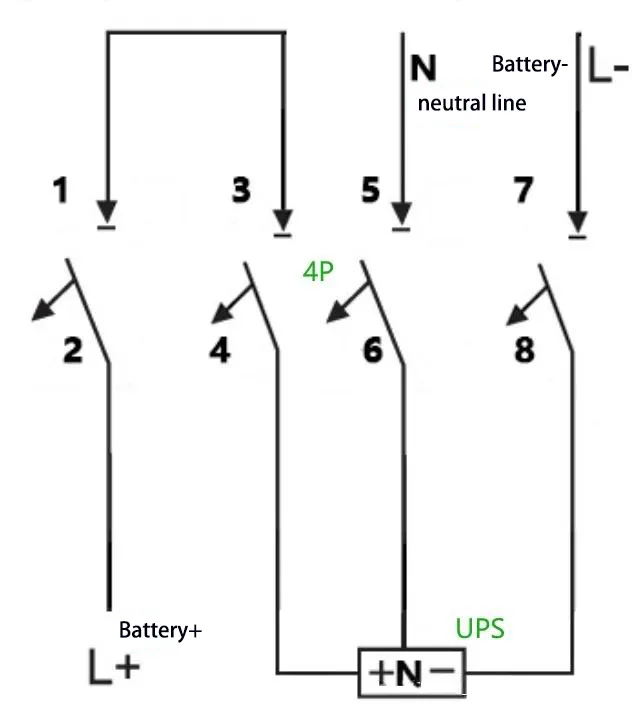 E:Misalnya: Untuk UPS dengan kapasitas 40 kVA, rangkaian baterai terukur 40 sel, dan sambungan kabel netral (menyamakan tegangan pengisian daya: 14 V × 40 = 560 V, yaitu ±280 V), arus pengoperasian maksimum dihitung sebagai 40 kVA × 1,0 90% 10 V 40 = 111 A. A 4P 750 V 150 Pemutus arus dapat digunakan, dengan dua kutub dihubungkan secara seri. Metode pengkabelan adalah sebagai berikut: